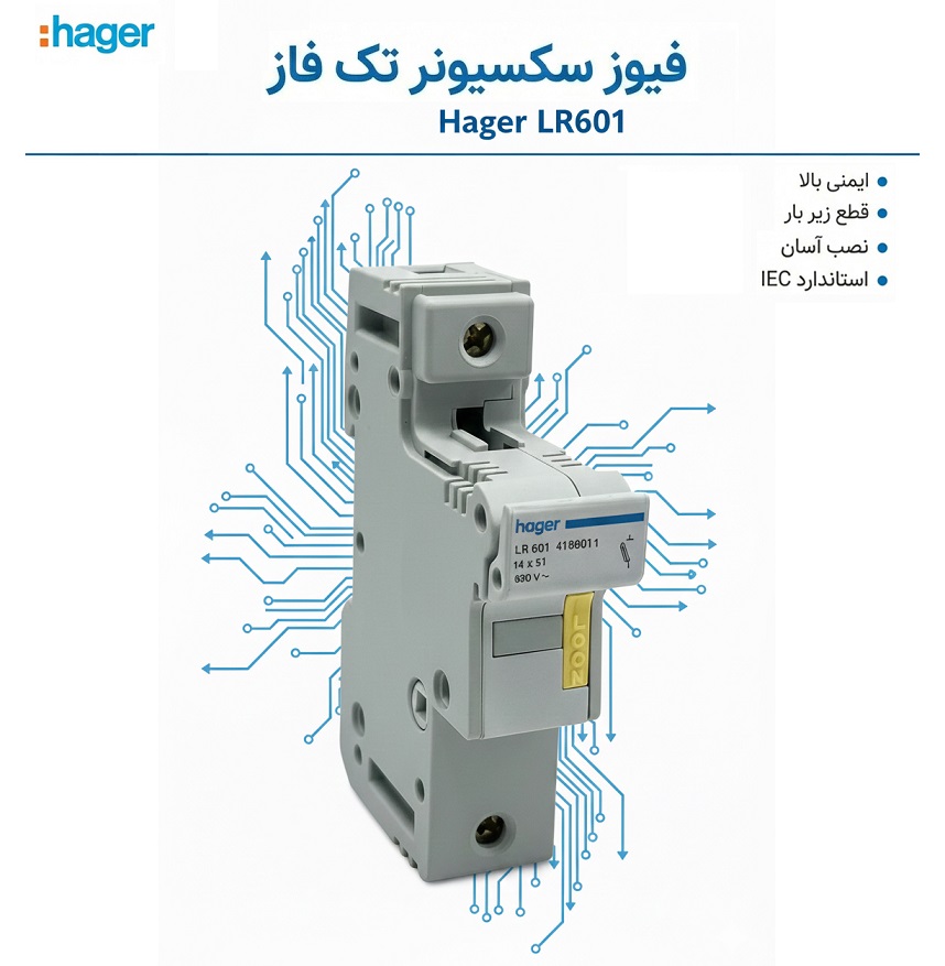 پایه فیوز سکسیونری LR 601 ساخت شرکت HAGER فرانسه ، با بدنهای مقاوم، نصب آسان روی ریل DIN و مناسب برای فیوزهای 14×51، گزینهای ایدهآل برای پروژههای ساختمانی، صنعتی و تجاری محسوب میشود.