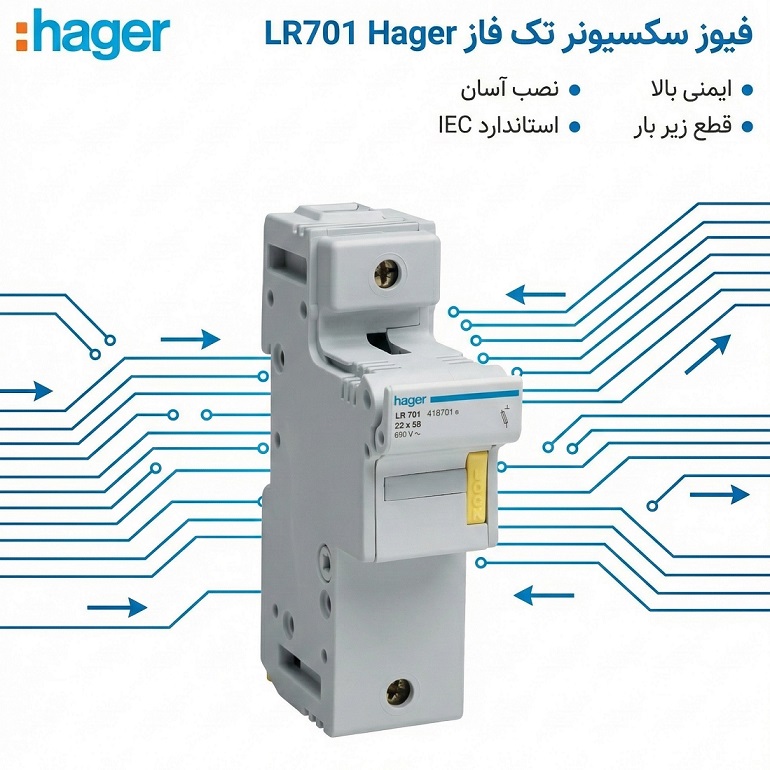 پایه فیوز سکسیونری LR 701 ساخت شرکت HAGER فرانسه ، با بدنهای مقاوم، نصب آسان روی ریل DIN و مناسب برای فیوزهای 22×58، گزینهای ایدهآل برای پروژههای ساختمانی، صنعتی و تجاری محسوب میشود.